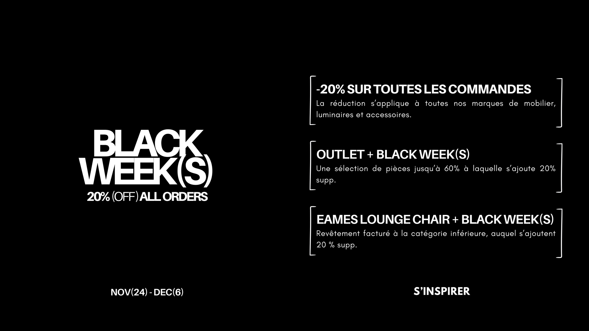 Durant les Blacks Week(s), du 24 novembre au 6 décembre, glissez le code ci-dessous au moment du paiement et profitez de 20 % de remise sur toute commande, même sur nos pièces Outlet.